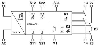 PSR-MC72-2NO-1DO-24DC-SC-2702096 Rơ le an toàn dùng cho dừng khẩn cấp và giám sát cửa an toàn, mạng chiếu sáng theo SIL 3 Cat. 3/ PL e, 1 hoặc 2 kênh, chức năng phát hiện ngắn mạch và sang mạch, có thể được kích hoạt lại, thời gian trễ cho chuyển mạch dự phòng (fall back/tightening delay) 0,2s tới 60s, 2 kênh tác động, Us = 24V DC , gắn din , đi dây dạng vặn vít , dày 12,5 mm