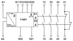 PSR-SPP- 24UC/ESAM4/3X1/1X2/B-2900510 Rơ le an toàn 1 hoặc 2 kênh dùng cho dừng khẩn cấp và giám sát cửa an toàn theo SIL 3, Cat. 4, PL e, 3 kênh tác động, điện áp đầu vào danh định Un= 24V AC/DC, đi dây dạng cắm nhấn, dầy 22,5mm.